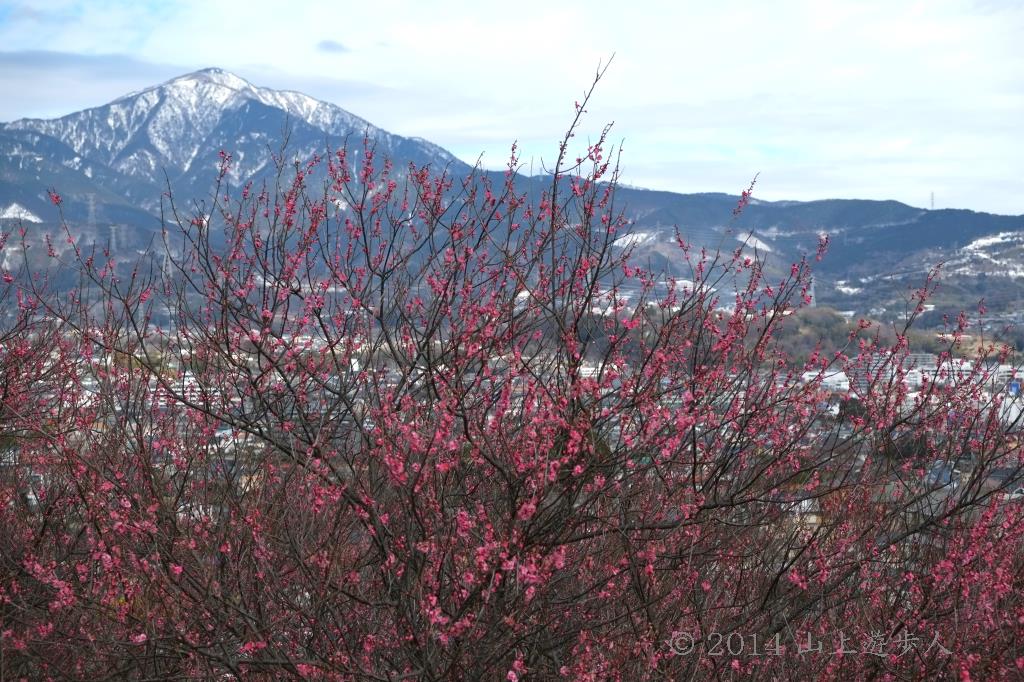 先日の大雪が消えない大山を背景に咲く紅梅は一時寒さを忘れさせてくれる。