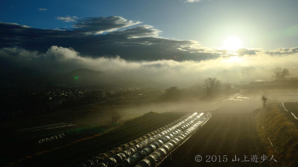 渋沢丘陵に張り出した霧が朝日を受けて一面セピア色の世界になりました。