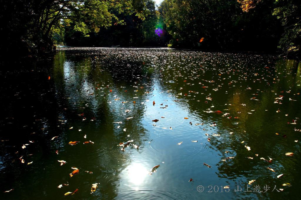 風邪に吹かれて大量の落ち葉が湖面を覆っていきます。