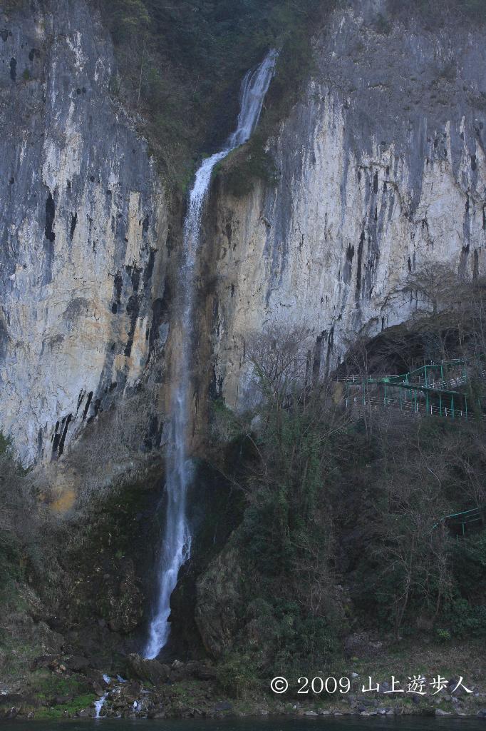 落差60mの三段の滝でこのすぐ右には全長 1,200mを超える鍾乳洞がある。