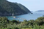 中央の青い端が生月大橋で、左億が平戸島、右側がが生月島。