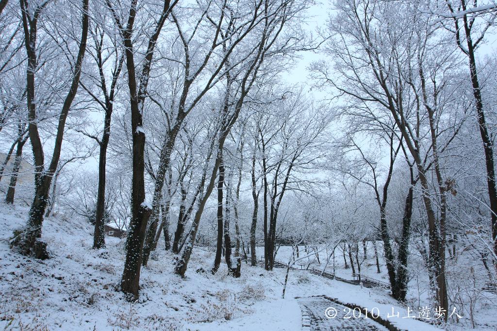 5年ぶりの本格的な降雪で立野緑地は一面の雪景色。