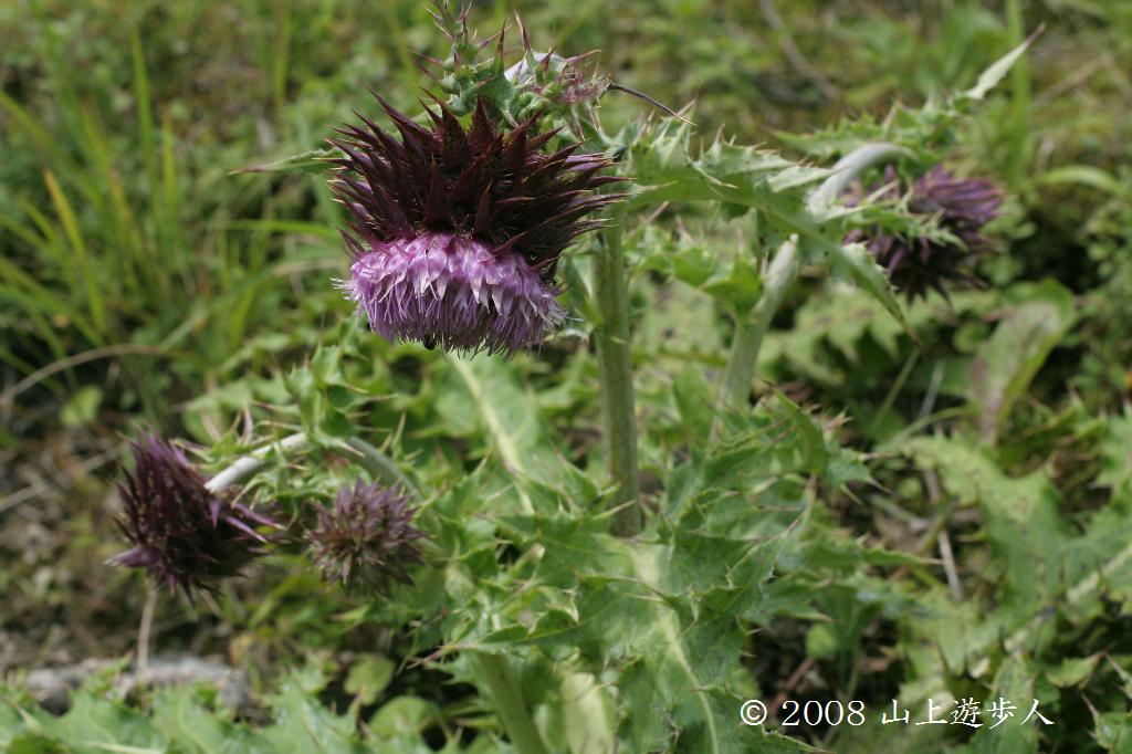 ひときわ大きな花をつけるこの花はフジアザミ。富士山とその周辺の山で見られる。