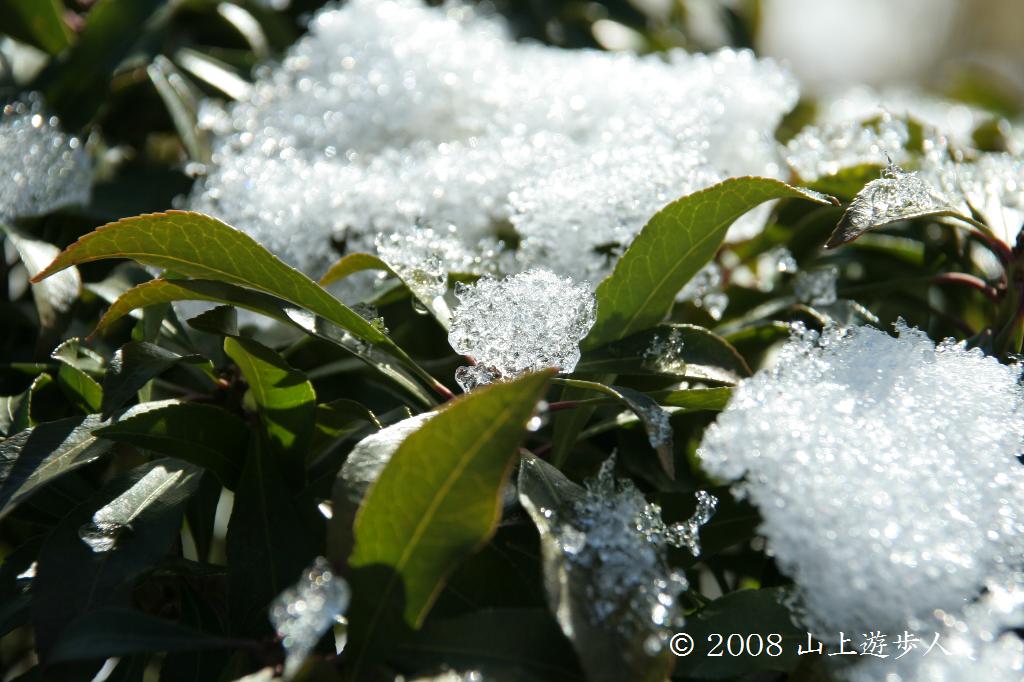 アセビの枝に積もった新雪がまるで氷の花のよう。