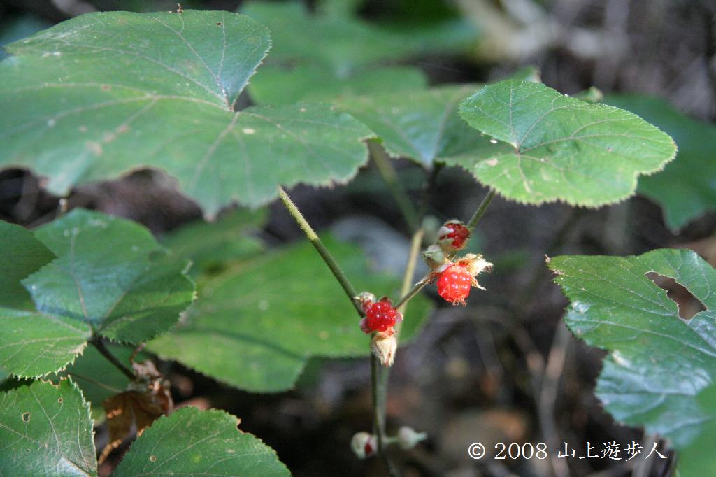 スギ林の中を歩いていると午後の日射しを受けフユイチゴの実が輝いていました。