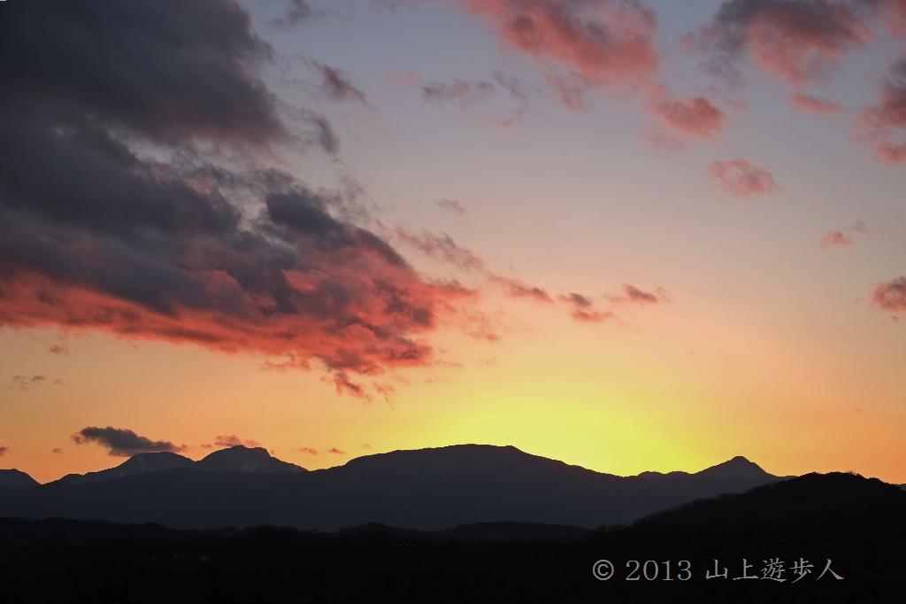 画面の左から駒が岳、神山、中央が明神岳、右のとがった山が金時山。