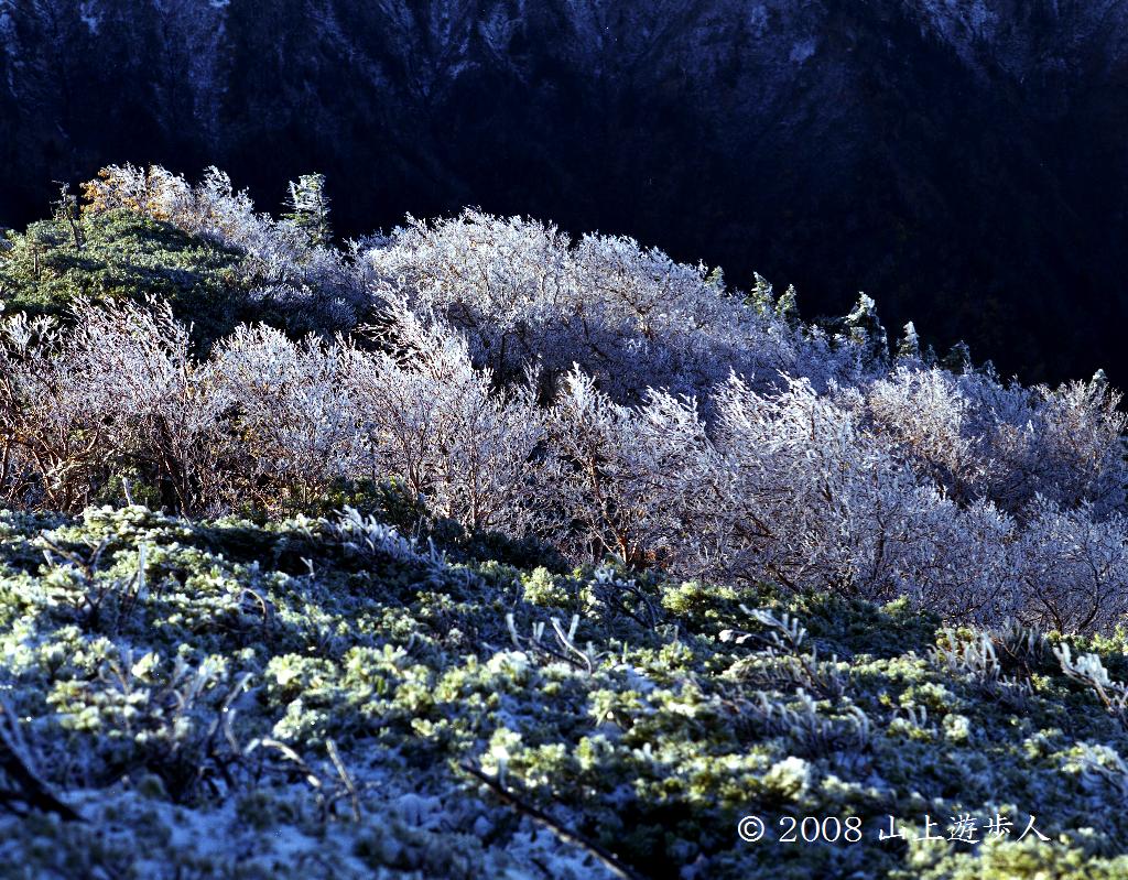 前日までの名残の紅葉が一夜にして霧氷に変わった。