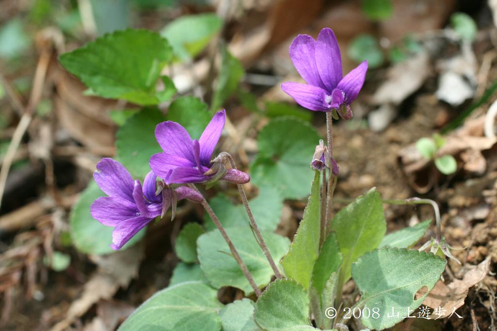 ひときわ目を引くこのスミレはアカネスミレ。花弁の基部以外に毛がないものはオカスミレという。