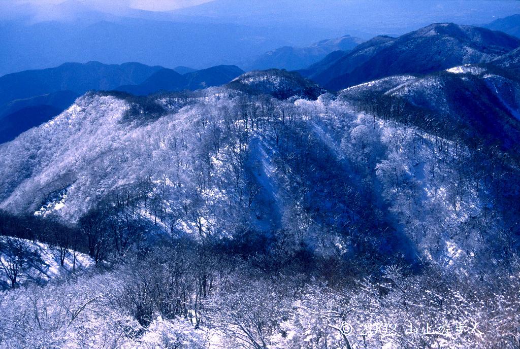 大丸一帯には美しいブナ林が残されている。霧氷に覆われたブナ林はまるで別の山を見るような美しさ。