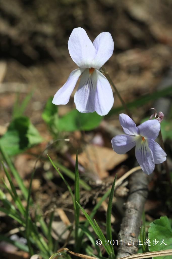 どこにでもあるタチツボスミレ だが左は白色に近く、右は距がかぎ型にまがったカギタチツボスミレと呼ばれるタイプ。