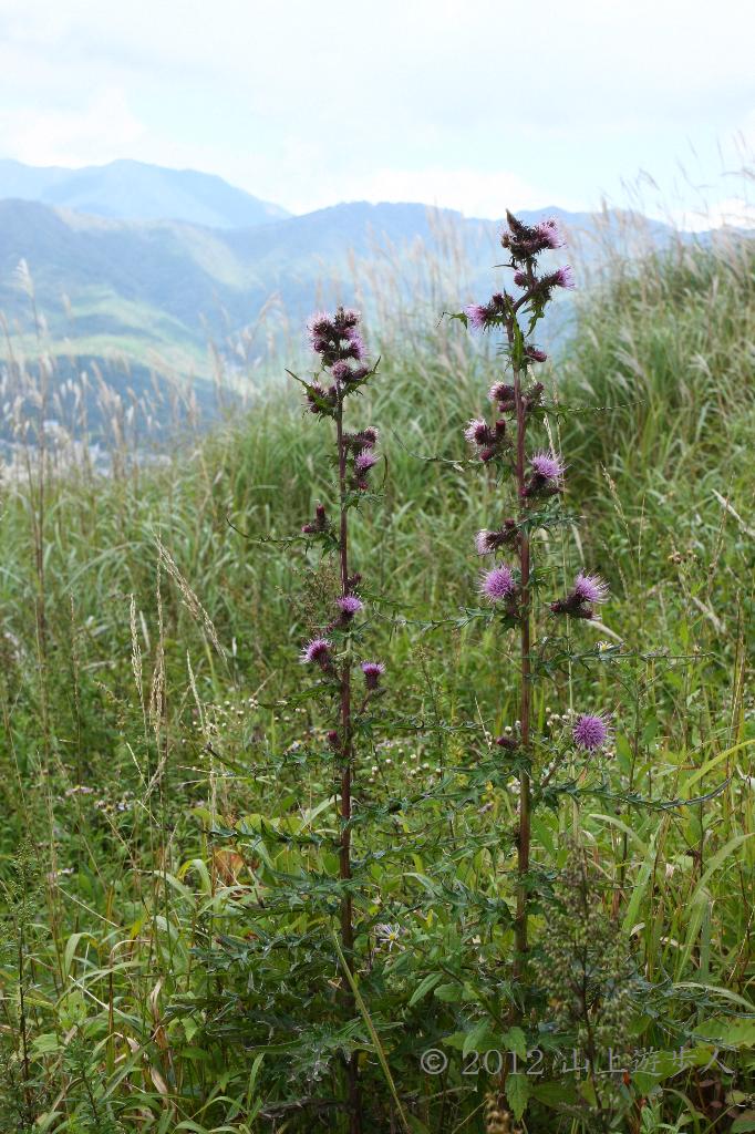 アズマヤマアザミに似ているけど頭花が違うので花名がわからなかったのですが、、アズマヤマアザミとタイアザミ(トネアザミ)の交雑種のようです。