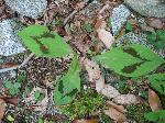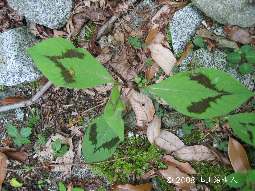登山道の脇にぞうりが落ちていました。と一瞬思ってしまうような奇妙な模様の葉。名前はなんというのだろう?(秋に赤い穂を付けるミズヒキでした) [2005/05/21]