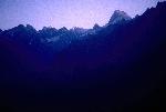 中央右の大きなピークがニルギリ・パルバット。中央左2つめの小さいピークはマナ・ピークか?