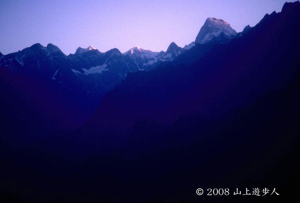 右の大きなピークがニルギリ・パルバット。すぐ左の黒いピークはDeoban Peak(6855)、その左なだらか山は無名峰(6977)、左端奥の三角状のピークはマナピーク(7272)、